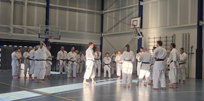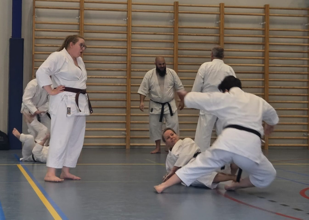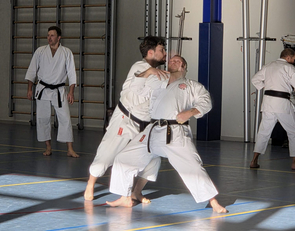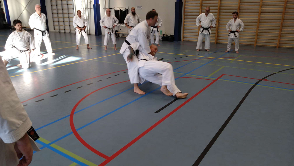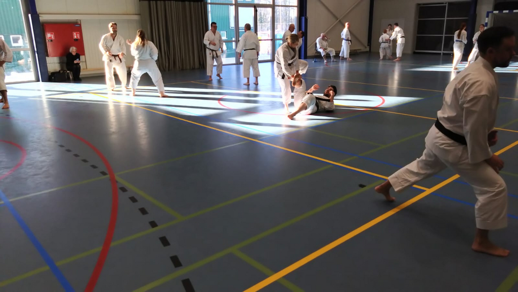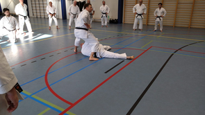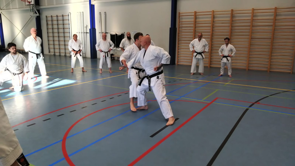 Für die Unterstufe wurde die Kata Bassai Dai in drei Teile zerlegt. Abschnittsweise wurde der Ablauf der Kata erlernt, wobei besonders auf die korrekte Ausführung geachtet wurde. Zu den einzelnen Sequenzen wurde jeweils die passende Anwendung demonstriert und geübt. Den Erklärungen und Anmerkungen zu den Details der Bewegungen und zum Hintergrund der Kata zu folgen gestaltete sich zeitweise schwierig, weil sie hauptsächlich auf flämisch erfolgte.